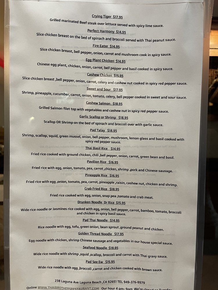 Welcome to Thai Brothers, a hidden gem nestled in the charming Laguna Beach. This unclaimed Thai restaurant invites you to indulge in a rich tapestry of flavors, featuring an array of vegan and vegetarian options. The menu highlights include the aromatic Tom Yum Hot & Sour Soup and the beloved Tom Kha Soup, both bursting with robust spices and comforting broth. For salad lovers, the Yum Gai Chicken Salad offers a delightful blend of fresh ingredients and zesty dressing.